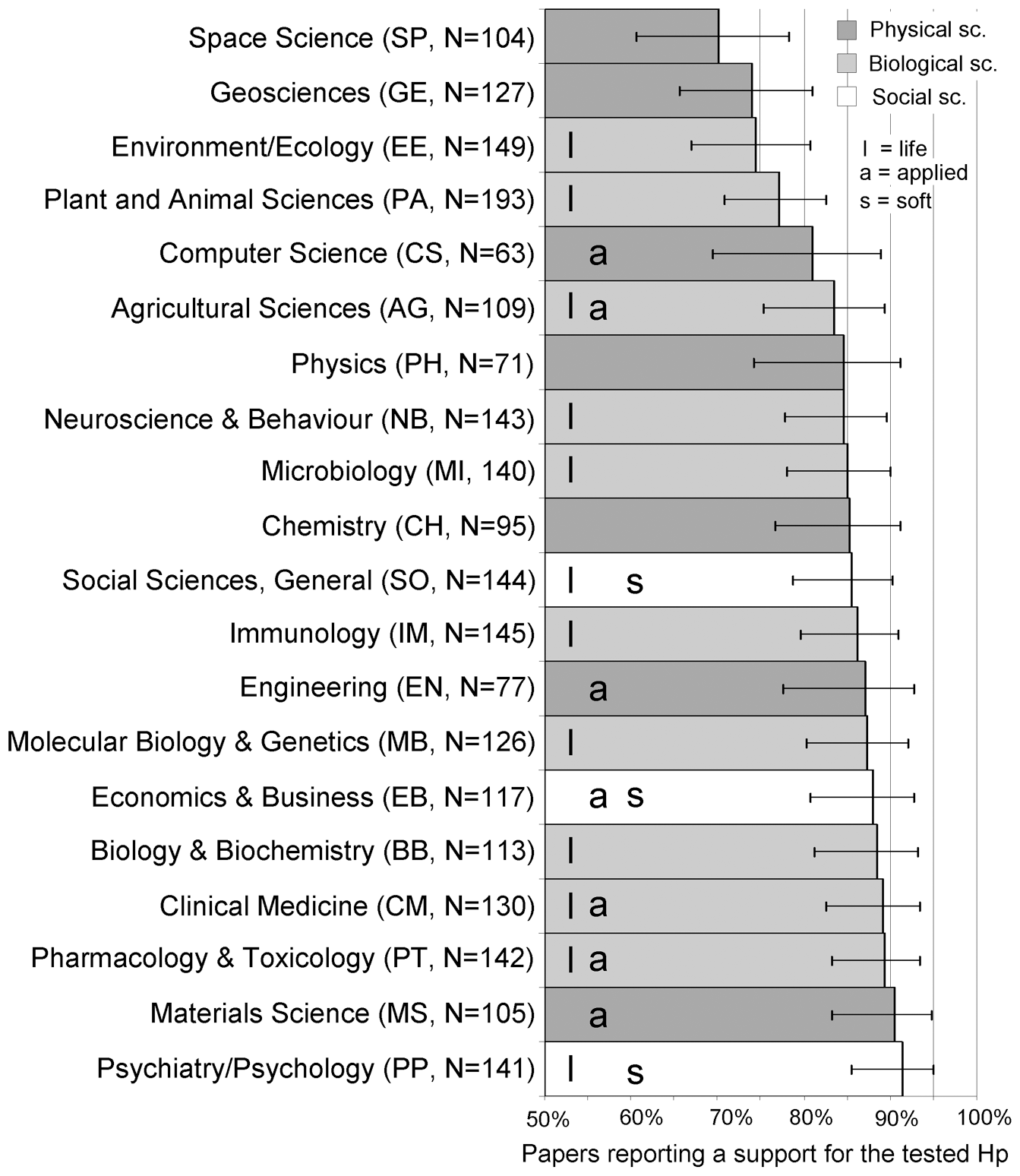 Figure 1. Percentage of papers with positive results by discipline, from Fanelli (2010).
